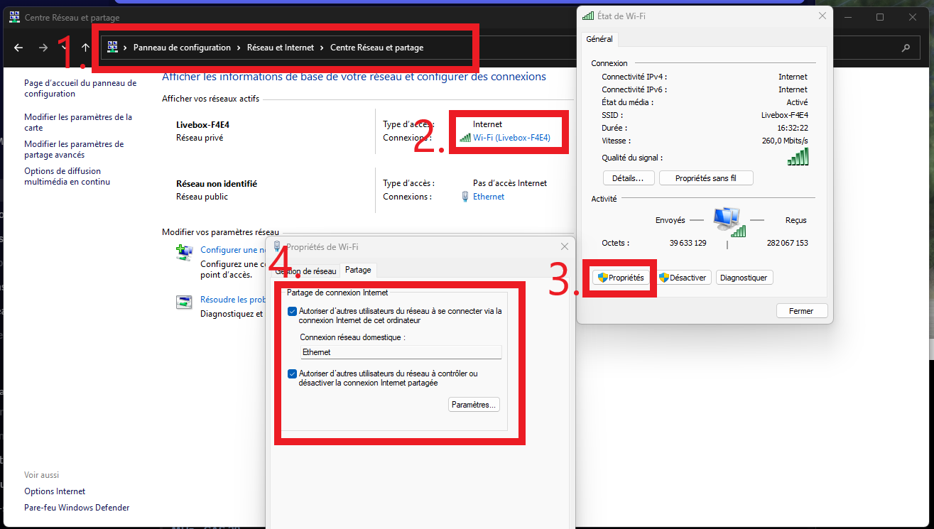 Pour cela, il lui faudra internet, donc j'utilise mon pc sous Windows 11 comme routeur pour Proxmox.