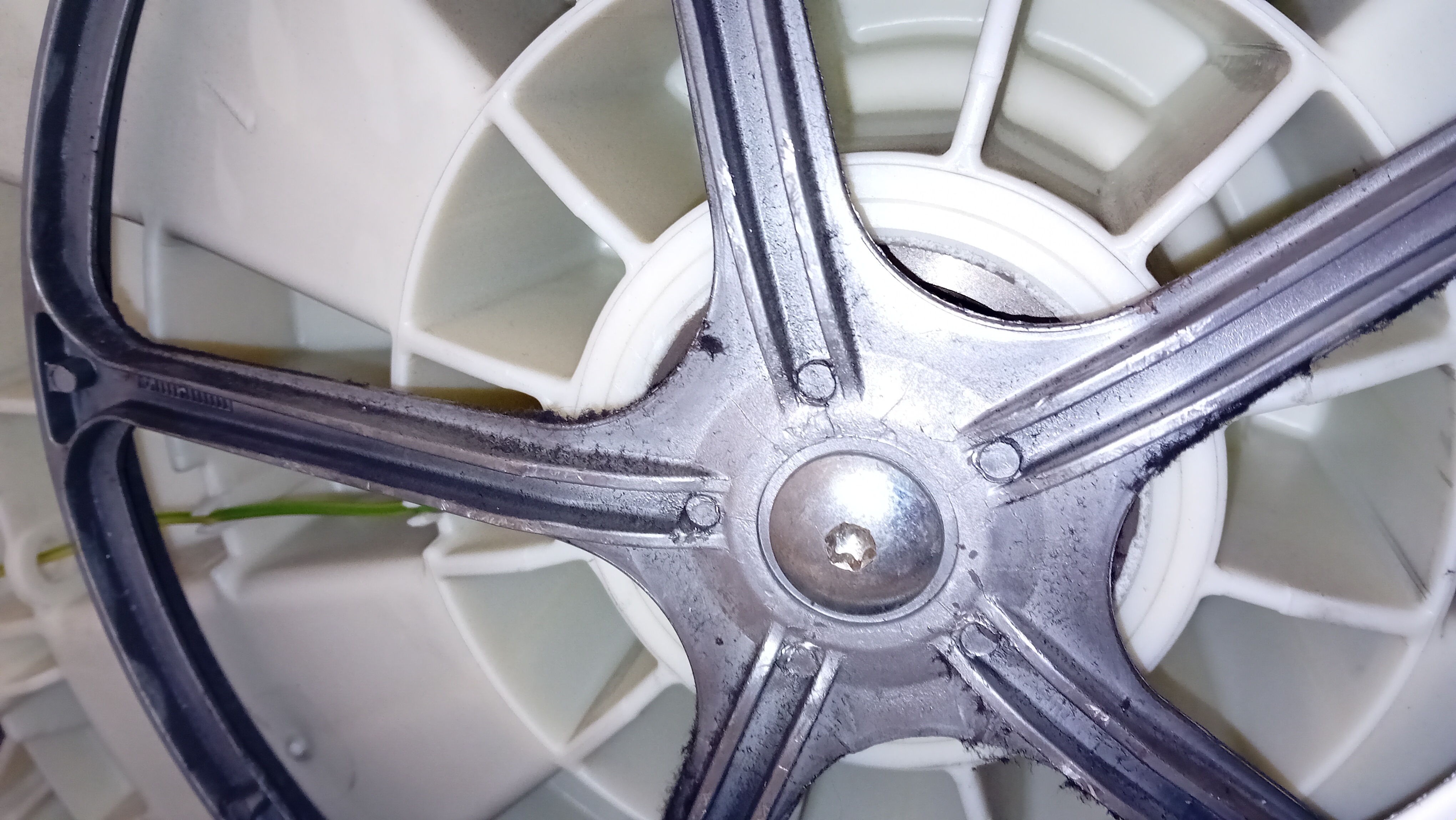 On commence lentement à tirer sur le tambour pour le faire sortir depuis le haut de la machine... et puis non. Il faut aussi enlever la poulie du tambour pour qu'elle puisse passer. Sauf que c'est plus compliqué que prévu...