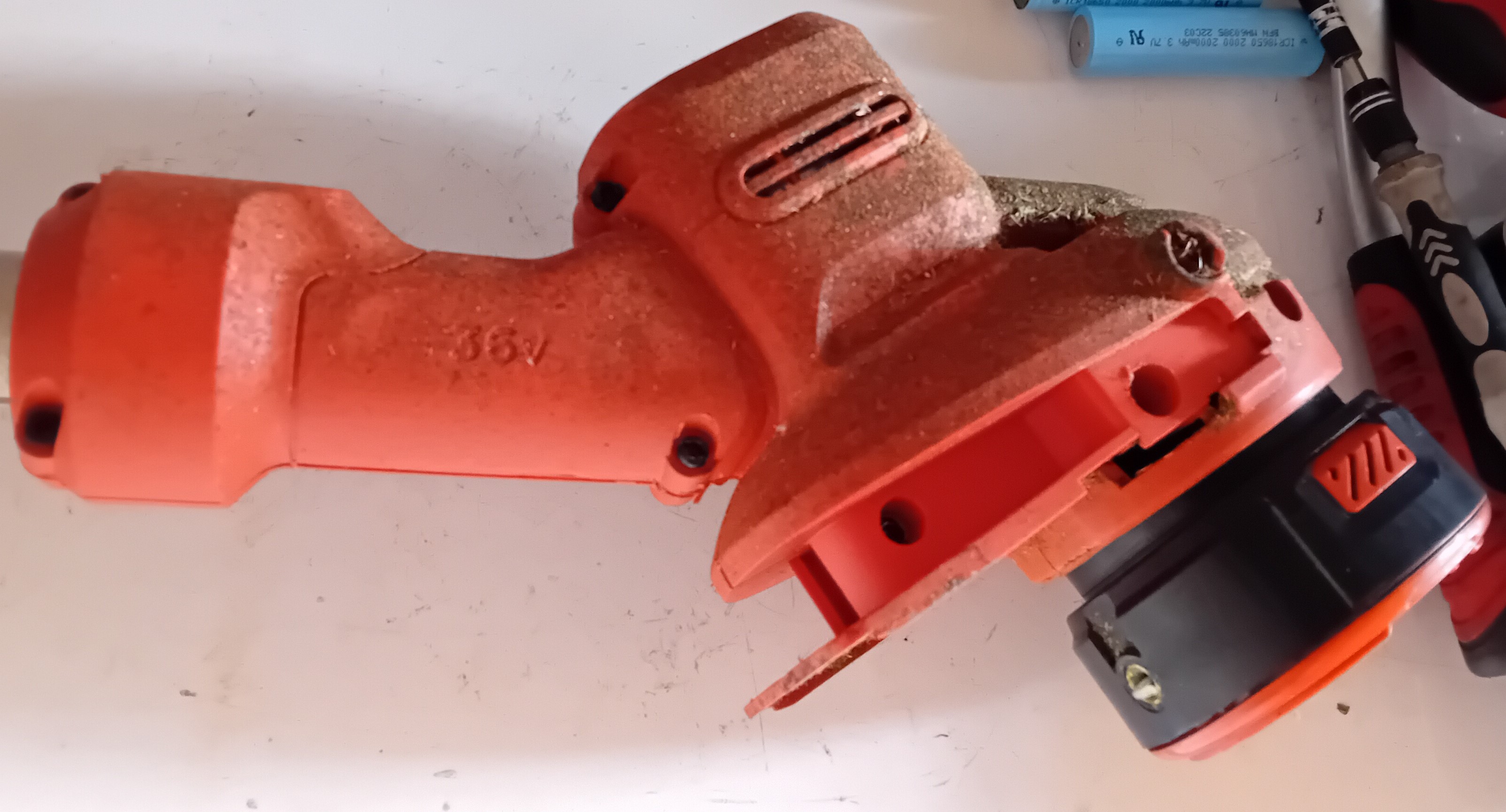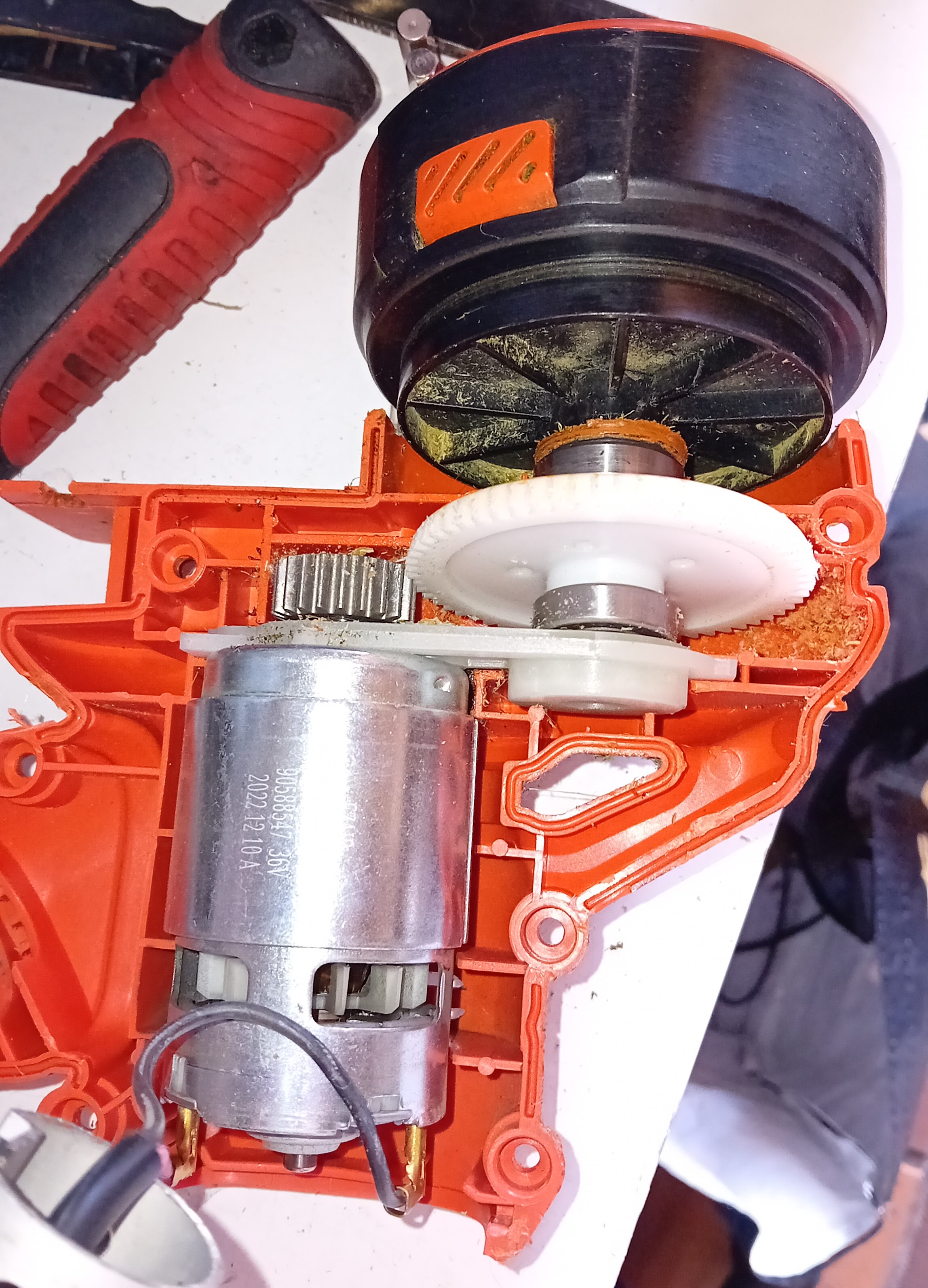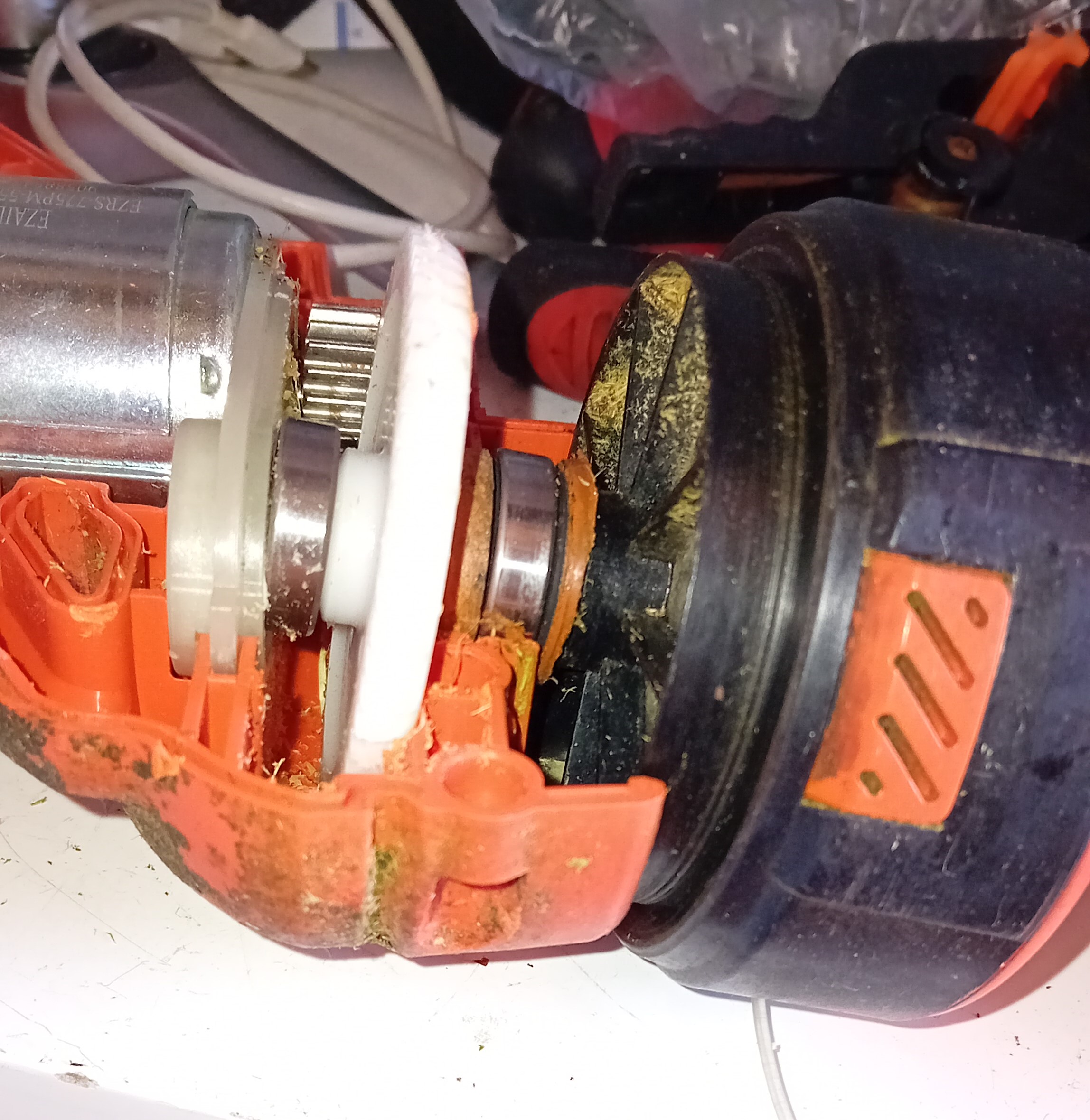 Enfin si, grâce aux avis des clients sur le produit. Le coupe bordure n'est en fait pas adapté aux gros travaux, ce qui fait que ça force sur le bloc noir, et fait frotter la roue crantée blanche sur le plastique, qui emmenait le plastique arraché vers l'intérieur. Avec la chaleur du moteur, ça s'enlevait plus facilement, et bien se coller ensuite autour de la roue crantée.