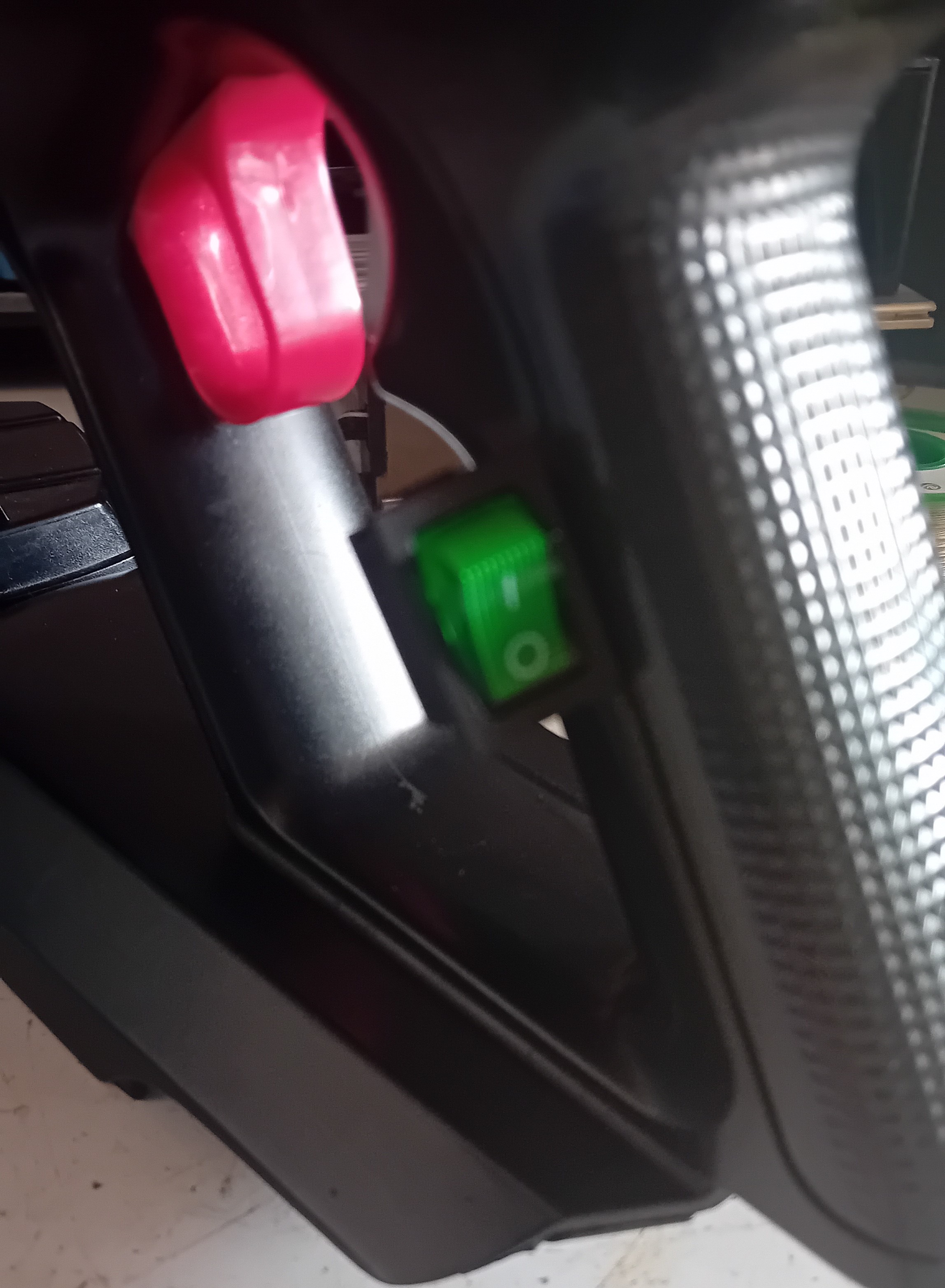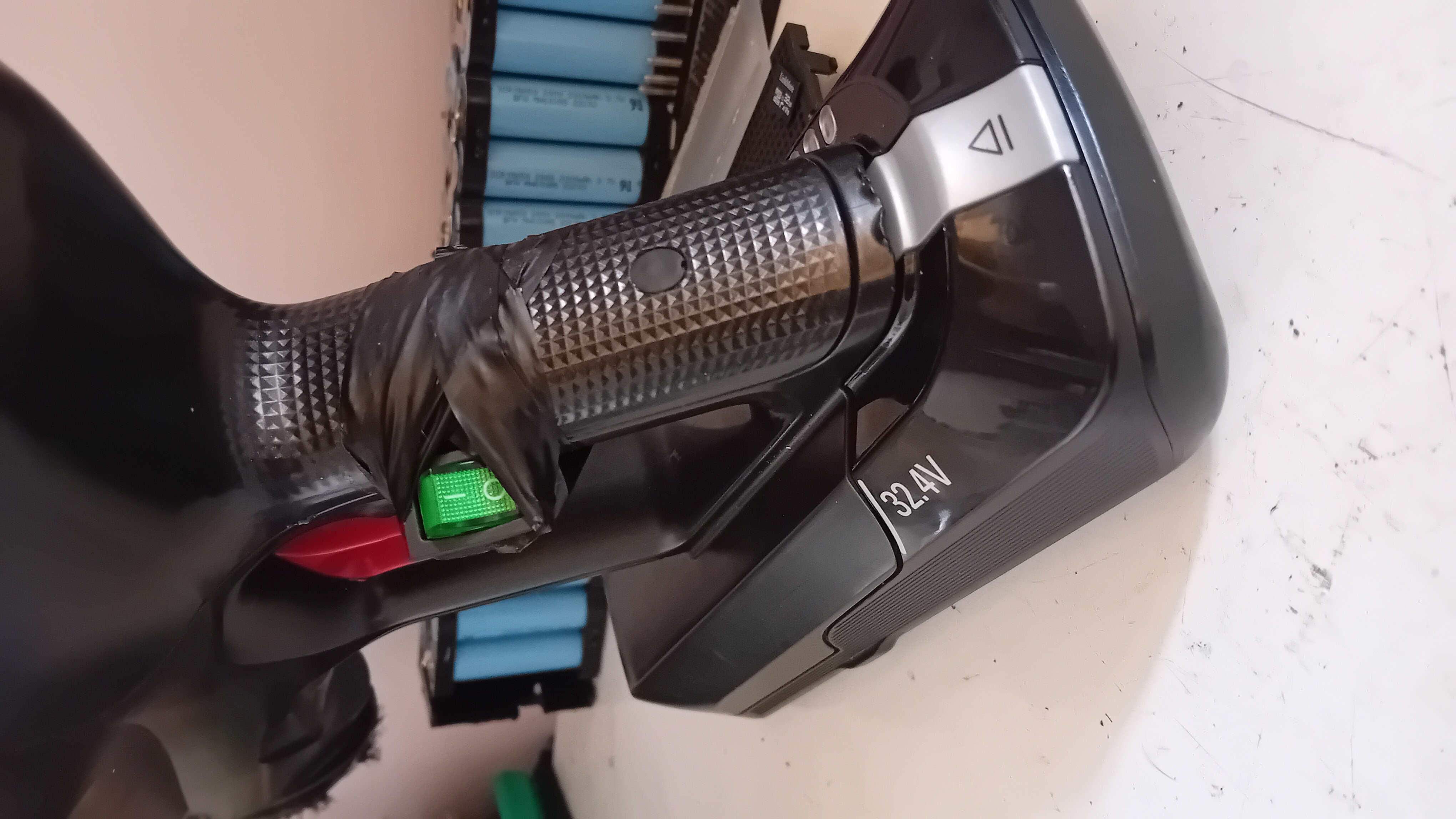 Etant un aspirateur Rowenta, le démontage pour accéder au bouton est compliqué, voir même pourrait casser d'autres pièces. Donc on décide de contourner le problème : on laisse le bouton, mais on en rajoute un sur le côté.