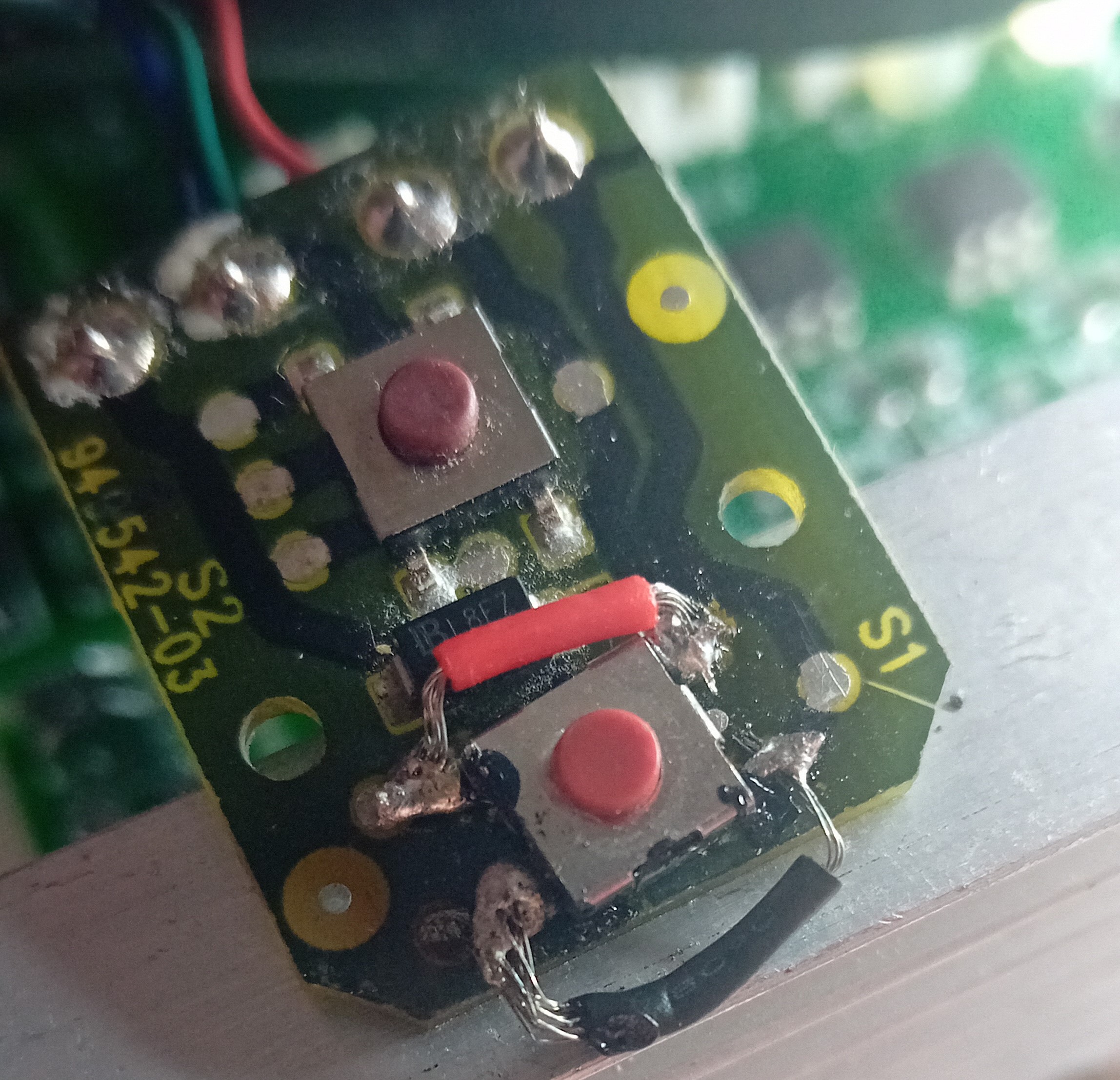 Pour ce faire, je soude deux fils pour relier chaque contact du bouton sur le PCB. Assez difficile, car le PCB a la bougeote.