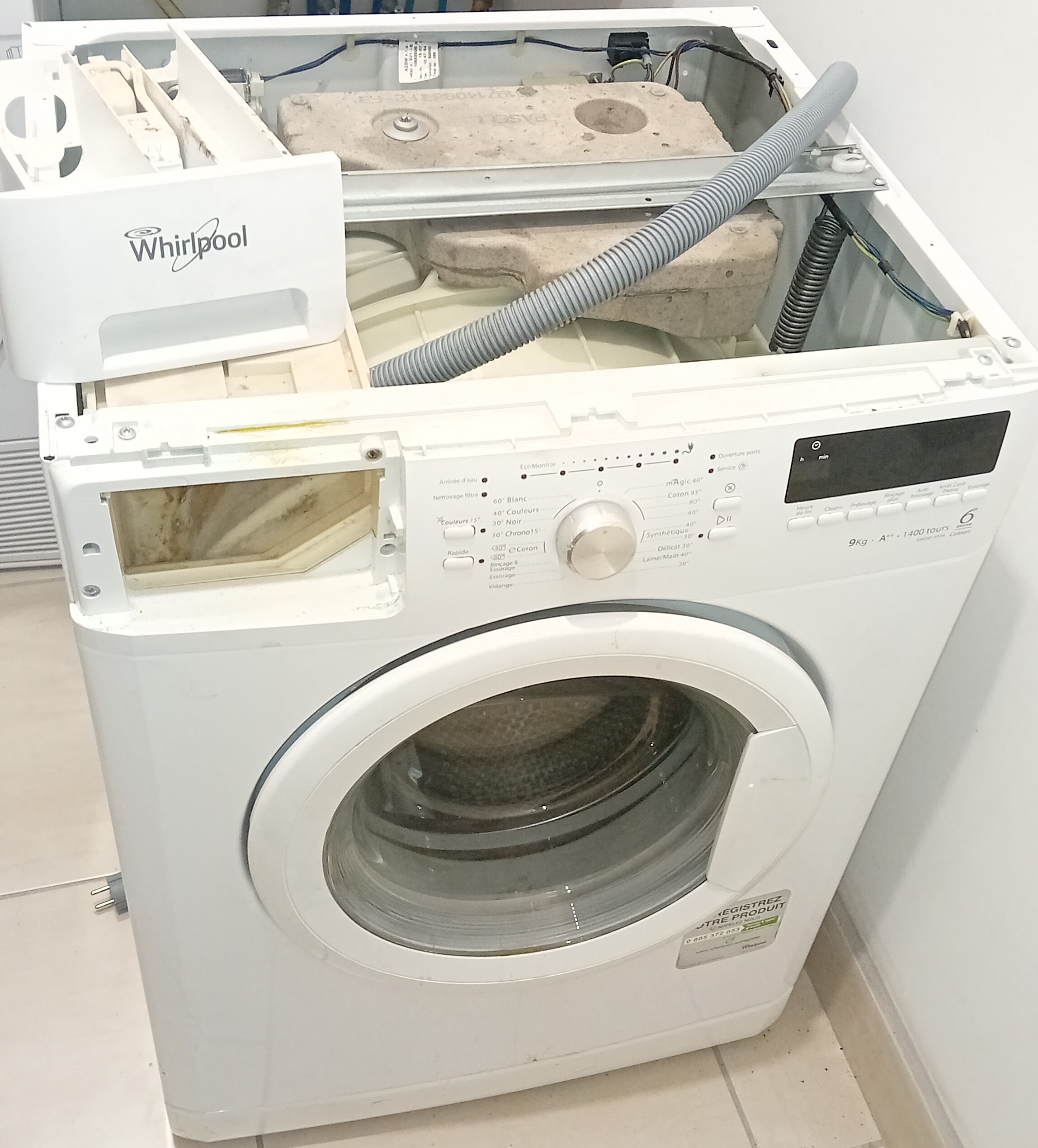 Ensuite nous avons une machine à laver. Il faut "juste" remplacer le tambour. Soit démonter toute la machine pour pouvoir le retirer.